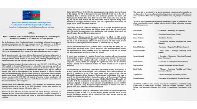 Xocalı soyqırımına siyasi-hüquqi qiymət verməklə bağlı dünya birliyinə çağırış edilib