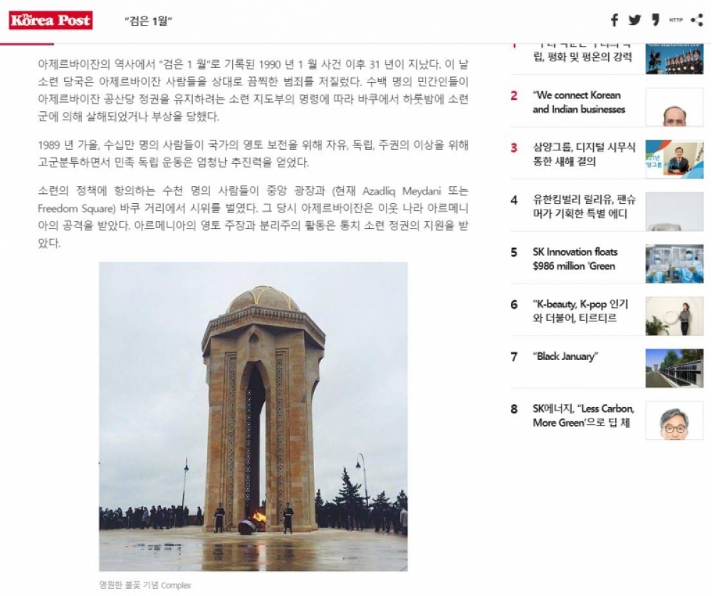 "The Korea Post" Azərbaycan xalqının həmin dövrdə azadlıq mübarizəsi ilə paralel olaraq, sovet rəhbərliyinin dəstəklədiyi qonşu Ermənistanın təcavüzü ilə də üz-üzə qaldığını yazır. Məqalədə Azərbaycanda həmin hadisələrin qurbanlarının xatirəsinin əziz tutulduğu, hər il yanvarın 20-də ölkədə milli matəm günü kimi qeyd olunduğu bildirilib.