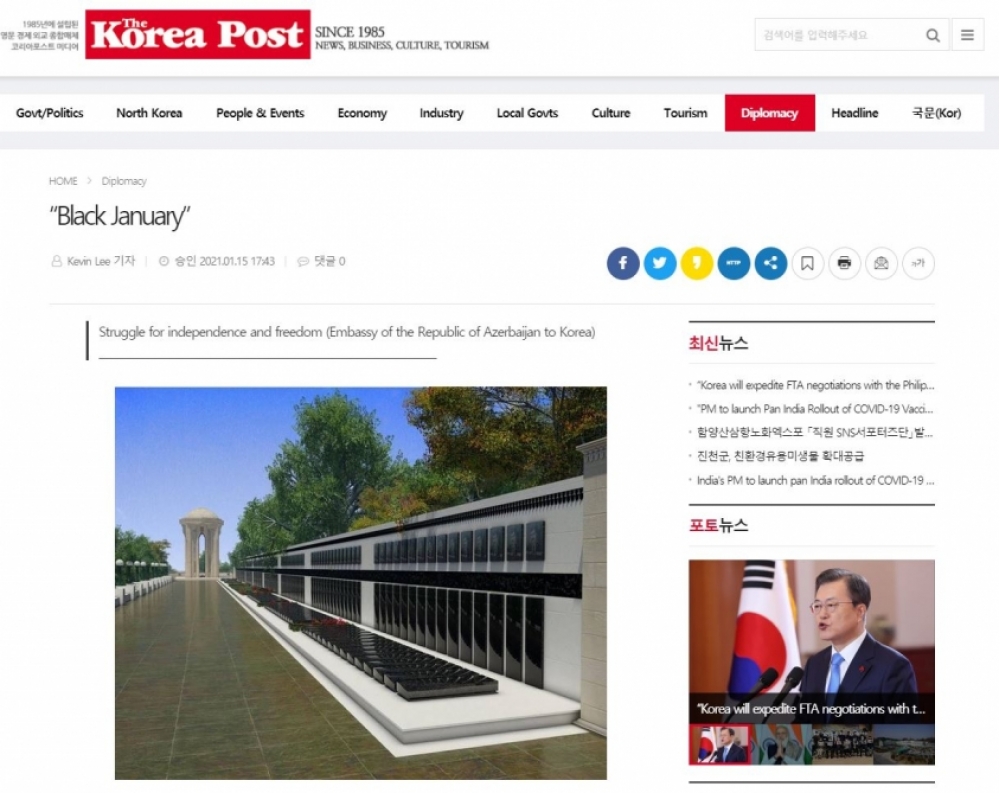 Koreya Respublikasının nüfuzlu “The Korea Post" qəzeti 1990-cı ildə Bakıda baş verən Yanvar hadisələrindən bəhs edən məqalə yayıb.