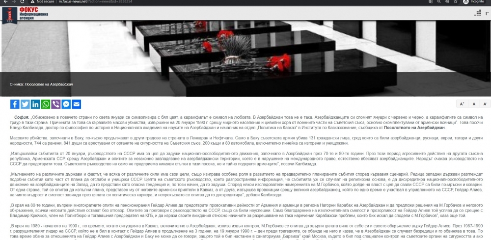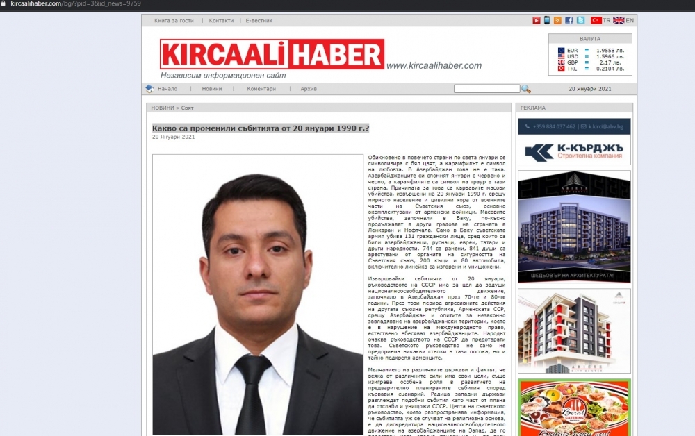 Bolqarıstanın “Fokus” xəbər agentliyi və “Kircaali Haber” qəzeti AMEA-nın Qafqazşünaslıq İnstitutunun Qafqaz siyasəti şöbəsinin müdiri, tarix üzrə fəlsəfə doktoru Elnur Kəlbizadənin “1990-cı ilin 20 Yanvar hadisələri nəyi dəyişdirdi?” sərlövhəli məqaləsini dərc edib.