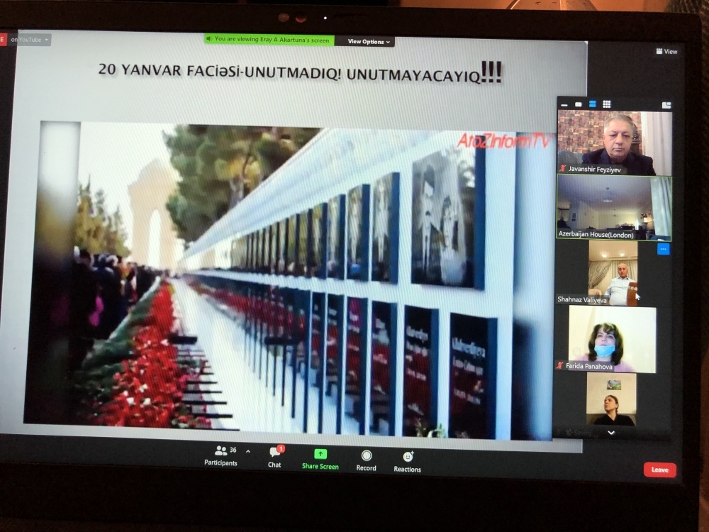 20 yanvar axşamı Londonda yerləşən və fəaliyyət göstərən “Azərbaycan Evi”nin təşəbbüsü ilə 20 Yanvar faciəsinə həsr olunmuş tədbir keçirilib. “İki sahil”in məlumatına görə, 20-dən çox dəvətlinin iştirakı ilə keçirilən tədbiri giriş sözü ilə “Azərbaycan Evi”nin sədri professor Əli Atalar açıb. Tədbir Azərbaycan Himninin səsləndirilməsi və 20 Yanvar faciəsinə həsr olunmuş video-filmin nümayişi ilə başlayıb. 2 saat davam edən on-line tədbirdə Azərbaycan Respublikasının Böyük Britaniyadakı səfiri Tahir Tağızadə, Londonda yaşayan, 1990-cı ildə 20 yanvar faciəsindən dərhal sonra Bakıya səfər etmiş və hadisələri yerində öyrənmiş gürcü əsilli antropoloq-alim professor Tamara Draqadze, Azərbaycan Xalq Cümhuriyyətinin qurucularından biri olmuş Əhməd bəy Pepinovun nəvəsi Ülvi Pepinova, Böyük Britaniyada fəaliyyət göstərən GHT rəhbəri Fəridə Pənahova, İrlandiyadan olan tarixçi alim Patrik Volş, Böyük Britaniya media nümayəndəsi Neyl Vatson, Şotlandiyada təhsil alan Azərbaycanlı tələbə Qasım Qurbanov və Milli Məclisin üzvü, Azərbaycan-Böyük Britaniya parlamentlərarası dostluq qrupunun sədri Cavanşir Feyziyev çıxışlar ediblər.