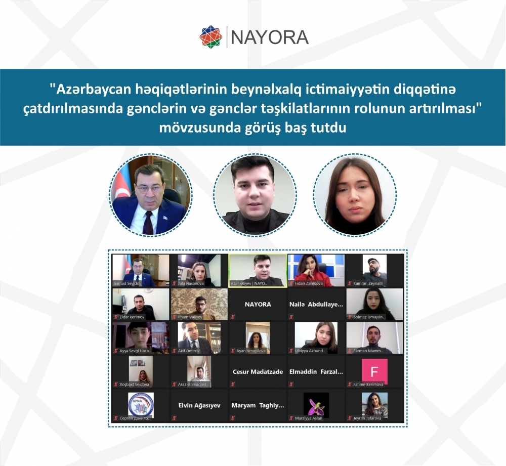 Bununla yanaşı, NAYORA beynəlxalq təmsilçiliyin gücləndirilməsi üçün səylə çalışır. Müzəffər Ali Baş Komandan İlham Əliyevin rəhbərliyi altında rəşadətli Ordumuzun şanlı qələbəsindən sonra NAYORA üzvlüyündə olan gənclər təşkilatlarını beynəlxalq sferada fəal mübarizəyə çağırmış və bu istiqamətdə təşkilatların fəaliyyətlərinin inkişafı üçün əsaslı addımlar atmışdır. Bunlardan biri də 25 fevral tarixində “Azərbaycan həqiqətlərinin beynəlxalq ictimaiyyətin diqqətinə çatdırılmasında gənclərin və gənclər təşkilatlarının rolunun artırılması" mövzusunda Milli Məclisin beynəlxalq münasibətlər və parlamentlərarası əlaqələr komitəsinin sədri Səməd Seyidovla gənclər təşkilatlarının görüşünün təşkil edilməsi olub. Görüşdə Azərbaycanın haqq səsinin dünyaya çatdırılmasında gənclərin və gənclər təşkilatlarının düzgün təbliğat üsullarından istifadə etməsi, beynəlxalq təmsilçilikdə gənclərin və gənclər təşkilatlarının rolu kimi mövzular müzakirə olunub və Səməd Seyidov beynəlxalq təmsilçilik ilə bağlı öz tövsiyələrini və təcrübələrini gənclərlə bölüşüb.