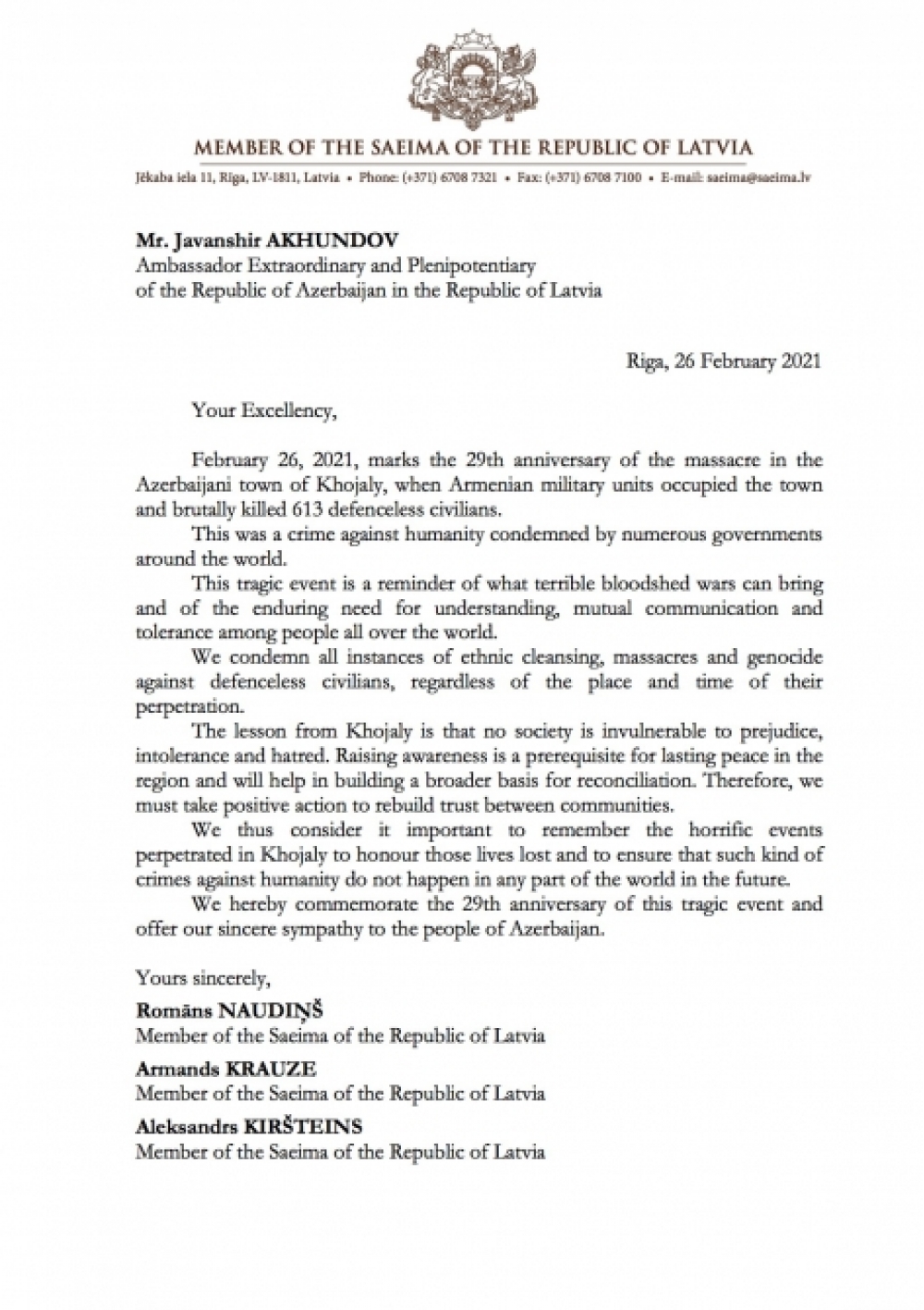 Latviya Respublikası Parlamentinin (Seym) üzvləri Xocalı soyqırımının 29-cu ildönümü ilə əlaqədar Azərbaycan Respublikasının bu ölkədəki səfirliyinə məktub ünvanlayıb.