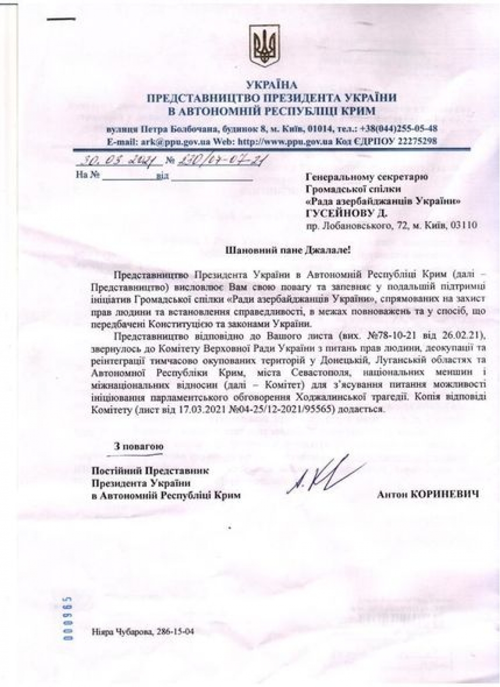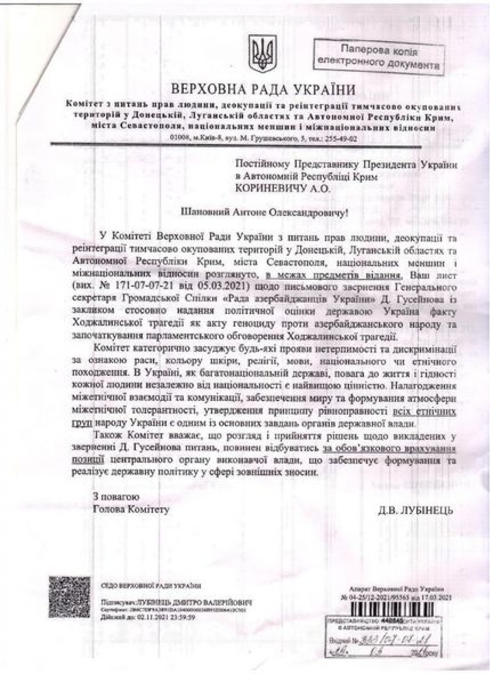 Ukrayna Ali Radasının insan haqları, milli azlıqlar, millətlərarası münasibətlər və müvəqqəti işğal olunmuş ərazilərin azad olunması və reinteqrasiyası üzrə Komitəsinin sədri Dmitri Lubinetsin imzası ilə cavab məktubu gəlib. Məktubda vurğulanıb ki, Ukrayna dözümsüzlük və ayrı-seçkiliyə əsaslanan bütün fəaliyyəti qətiyyətlə pisləyir.