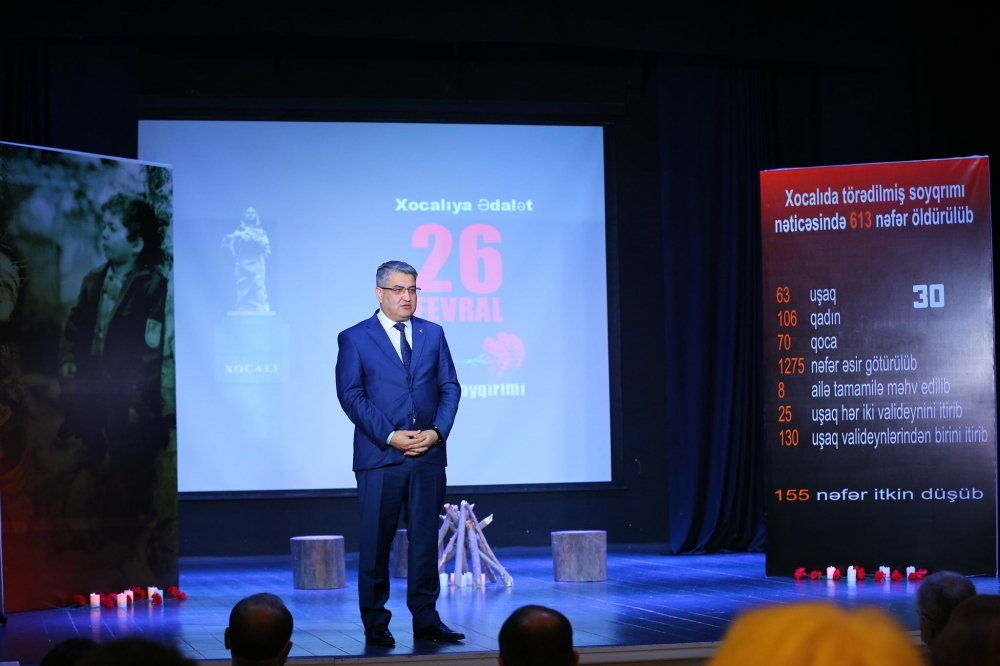 Azərbaycan Respublikası Milli Məclisinin deputatı Kəmaləddin Qafarov çıxışında bildirdi ki, 2008-ci ildə Heydər Əliyev Fondunun vitse-prezidenti Leyla Əliyevanın təşəbbüsü ilə başlanmış "Xocalıya ədalət!” beynəlxalq kampaniyası bu istiqamətdə təbliğat işini daha da fəallaşdırmış və faciə ilə əlaqədar dəhşətli faktlar bu kampaniya çərçivəsində aparılan işlər sayəsində geniş beynəlxalq ictimaiyyətə çatdırılmış, planetin bütün guşələrində milyonlarla insan erməni millətçilərinin əsl simasına bələd olmuş və bilmişlər ki, ermənilər öz sərsəm ideyalarını həyata keçirmək naminə heç nədən, hətta uşaqları belə qətlə yetirməkdən çəkinməmişlər. Həmçinin əlavə etdi ki, “Xocalı faciəsi”nin 30-cu ildönümü yaşansa da, hələ də Azərbaycanın bütün vətəndaşlarının o dəhşətli, faciəli gecəni, xalqımızın başına gətirilən bəlaları unutmadığını, milli azadlıq, müstəqillik uğrunda qəhrəmanlıq göstərən oğul və qızlarımızı hörmətlə yad etdiklərini bildirdi.