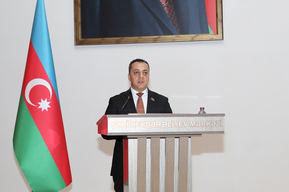Şəki şəhərinin Heydər Əliyev Mərkəzində təşkil olunan tədbir Ulu Öndərin və Azərbaycan Respublikasının suverenliyi və ərazi bütövlüyü uğrunda canlarından keçmiş Vətən övladlarının əziz xatirəsinin bir dəqiqəlik sükutla yad edilməsi və Dövlət Himninin səsləndirilməsi ilə başlanıb.