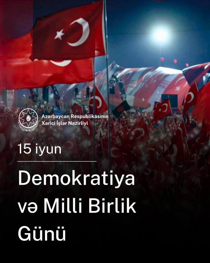 Azərbaycan Xarici İşlər Nazirliyi (XİN) Türkiyənin 15 iyul - Demokratiya və Milli Birlik Günü münasibətilə paylaşım edib.