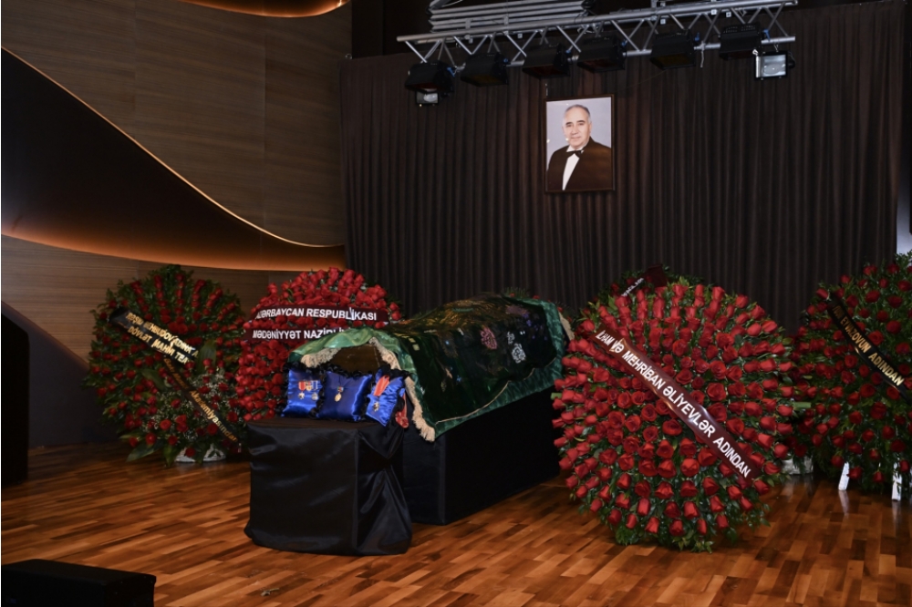 “İki sahil” xəbər verir ki, mərhumun cənazəsi Beynəlxalq Muğam Mərkəzinin matəmsayağı bəzədilmiş səhnəsində postament üzərinə qoyulmuşdu.