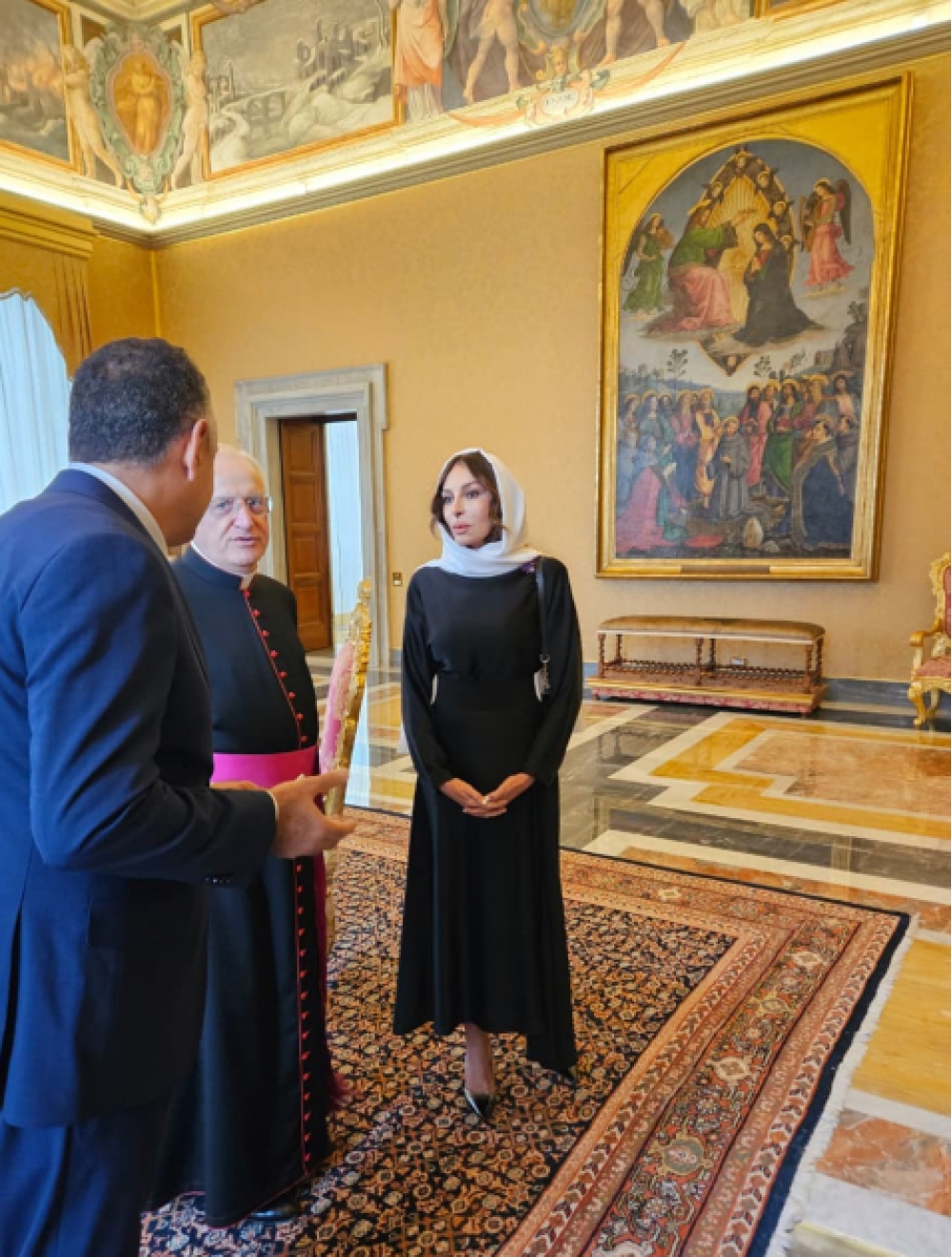 Roma Papası XIV Leo Vatikan dövləti ilə Azərbaycan Respublikası arasında ikitərəfli əməkdaşlığın uzun tarixə malik olduğunu diqqətə çatdırıb. Roma Papası bir neçə il əvvəl Mehriban xanımın irəli sürdüyü təşəbbüslər sayəsində münasibətlərin xeyli inkişaf etdiyini deyərək, Birinci vitse-prezidentə təşəkkürünü bildirib. XIV Leo bu əməkdaşlığın dinlərarası və sivilizasiyalararası dialoqa çox böyük təkan verdiyini, Azərbaycanın da bu baxımdan dünya miqyasında ilk sıralarda yer aldığını qeyd edib.