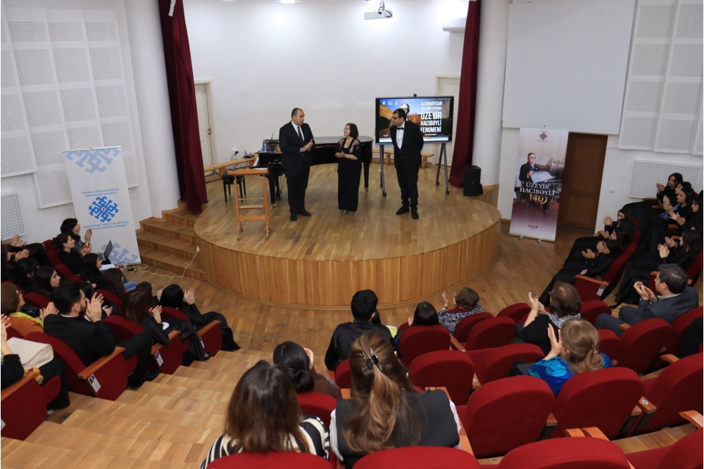 “İki sahil” xəbər verir ki, dahi bəstəkar, musiqişünas alim, pedaqoq, publisist, dramaturq, ictimai xadim Üzeyir Hacıbəylinin 140 illiyinə həsr olunan tədbirdə universitetin professor-müəllim heyəti və tələbələri iştirak ediblər.