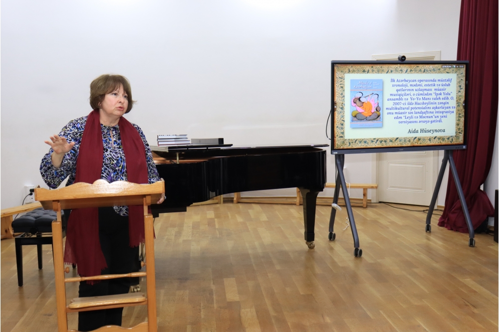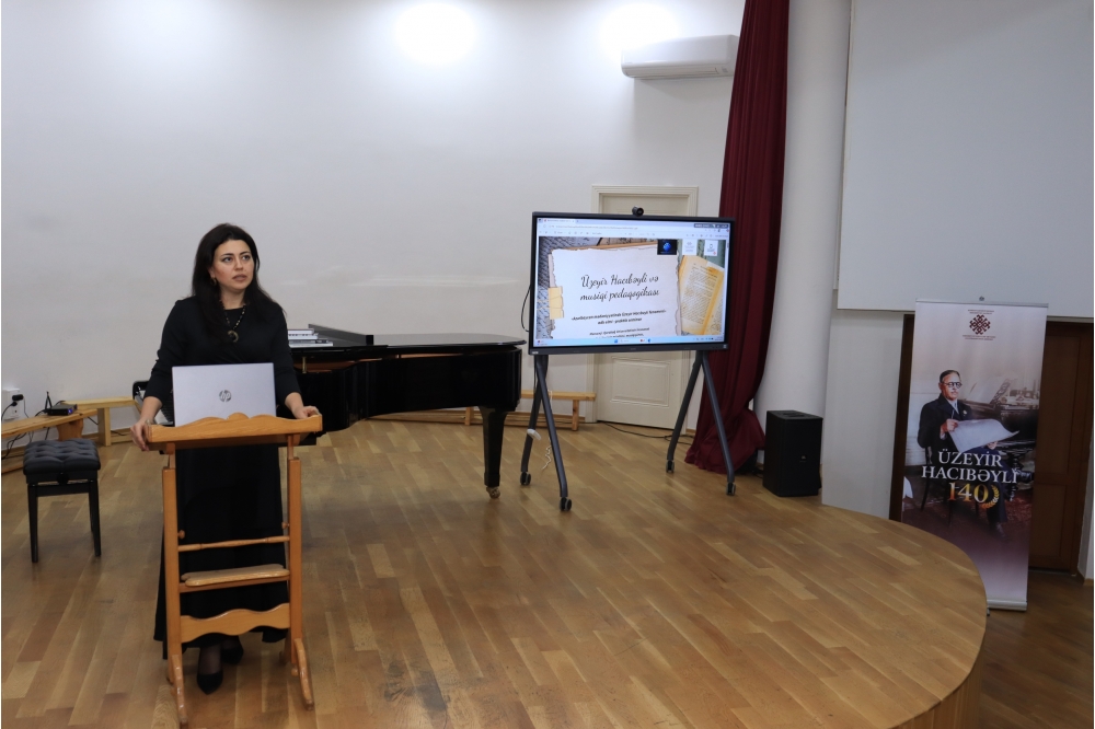 Sənətşünaslıq üzrə fəlsəfə doktoru, Qarabağ Universiteti İncəsənət fakültəsinin baş müəllimi Aybəniz Növrəsli “Üzeyir Hacıbəyli və musiqi pedaqogikası” mövzusunda çıxış edərək musiqi təhsili sahəsində mövcud müxtəlif sistemlərdən söz açıb, onlardan bəhrələnməyin zəruriliyi məsələsinə toxunub.