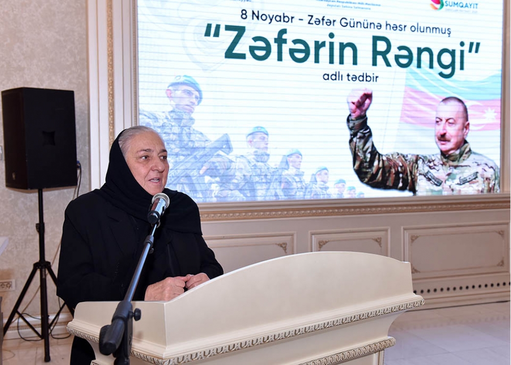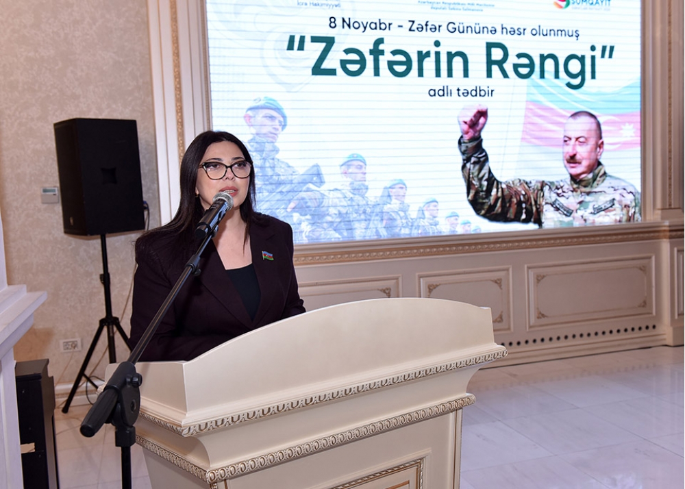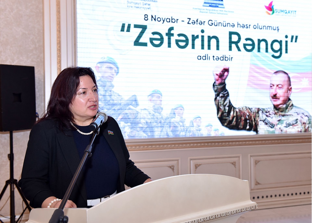 Milli Məclisin deputatı Səbinə Salmanova çıxışında təşkil olunan tədbiri Azərbaycan xalqının qəhrəmanlıq tarixinin bədii təcəssümü olaraq xarakterizə edib: “Zəfərin rəngi” sərgisi gənclərin Vətənə, şəhidlərə olan sevgisinin göstəricisidir. Biz bu əsərləri Sumqayıt məktəblərinə hədiyyə etməklə Zəfər tariximizi gələcək nəsillərə ötürmək istəyirik. Şəhidlərimizin ruhu qarşısında baş əyir, qazilərimizə minnətdarlığımızı bildiririk”.