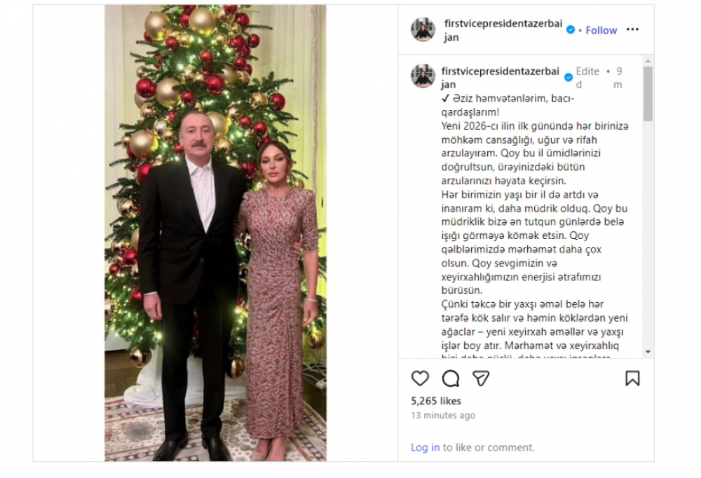 Azərbaycanın Birinci vitse-prezidenti Mehriban Əliyeva sosial media hesabında 2026-cı ilin ilk günündə Prezident İlham Əliyevlə birgə fotosunu paylaşıb.