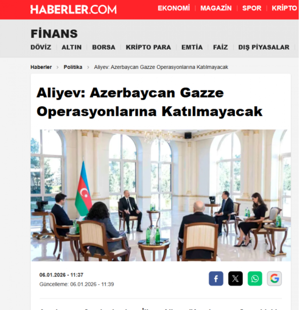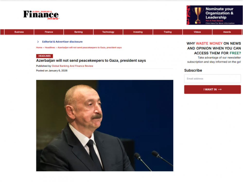 Beynəlxalq iqtisadiyyat portalı “İnvesting.com”, İsrailin “The Jerusalem Post”, “Israelhayom”, “Time of Israel” qəzetləri, rus dilində nəşr olunan “Vesti İzrail” portalı, Bolqarıstanın “Dnevnik” nəşri, Yunanstanın “Skai” internet resursu da Azərbaycan Prezidentinin Yaxın Şərqdə münaqişələrə dair fikirlərini dərc edib. Materiallarda qeyd olunub ki, Prezident İlham Əliyev Qəzza zolağına sülhməramlıların göndərilməsi ilə bağlı yayılan yanlış məlumatları təkzib edib və bu xəbərlərin ilk mənbəyi olan ABŞ tərəfinə diplomatik kanallarla 20 sualdan ibarət müraciət çatdırdığını, həmçinin bununla bağlı təəssüfləndiyini bildirib.