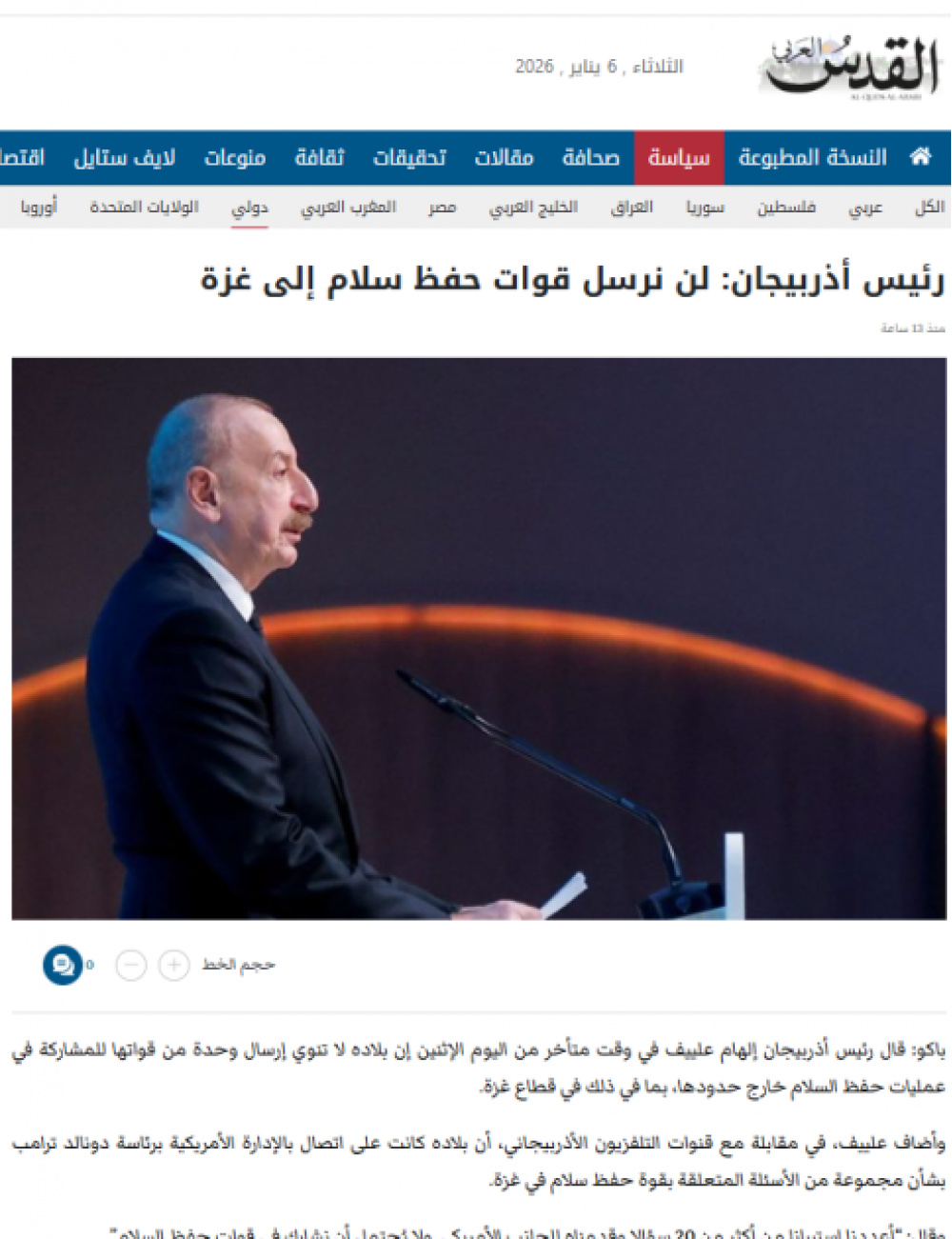 Ərəb mediasında yayılan xəbərlərdə və reportajlarda dövlətimizin başçısının Azərbaycanın Qəzzada sülhməramlı qüvvələrin tərkibində iştirakla bağlı mövqeyi, eləcə də qlobal proseslər və ABŞ-la münasibətlər əsas diqqət mərkəzində olub.