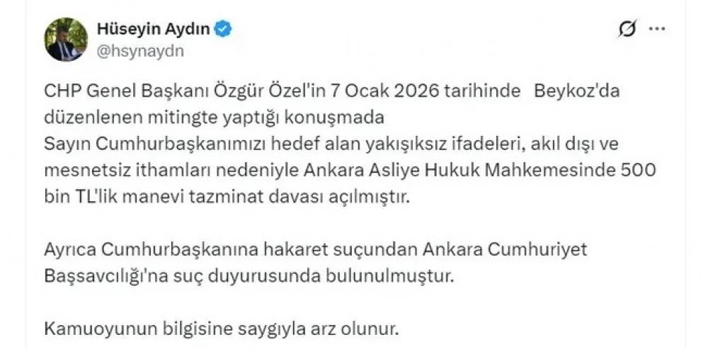 Ərdoğanın vəkili Hüseyn Aydın sosial şəbəkə hesabında məsələ ilə bağlı açıqlama yayıb. O qeyd edib ki, CHP sədri Özgür Özəlin Beykoz mitinqində Prezident Ərdoğanı hədəf alan uyğun olmayan ifadələri, əsassız və məntiqsiz ittihamları səbəbindən Ankara Asliye Hüquq Məhkəməsində 500 min türk lirəsi məbləğində mənəvi təzminat davası açılıb.