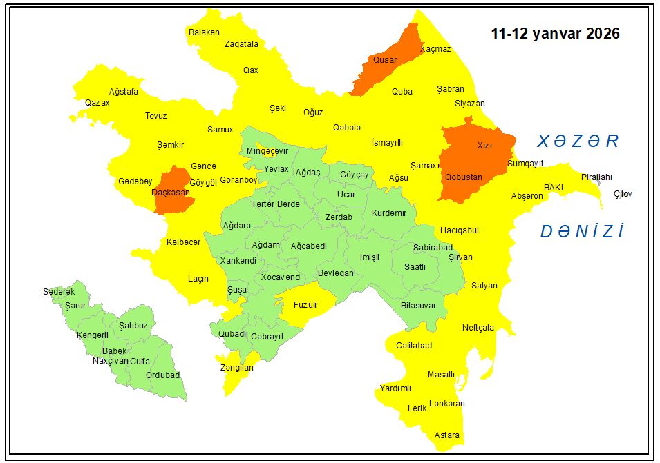 Milli Hidrometeorologiya Xidməti yanvarın 11-12-də Bakıda və Abşeron yarımadasında, eyni zamanda əksər bölgələrdə gözlənilən küləkli hava şəraiti ilə bağlı sarı və narıncı xəbərdarlıq verib.
