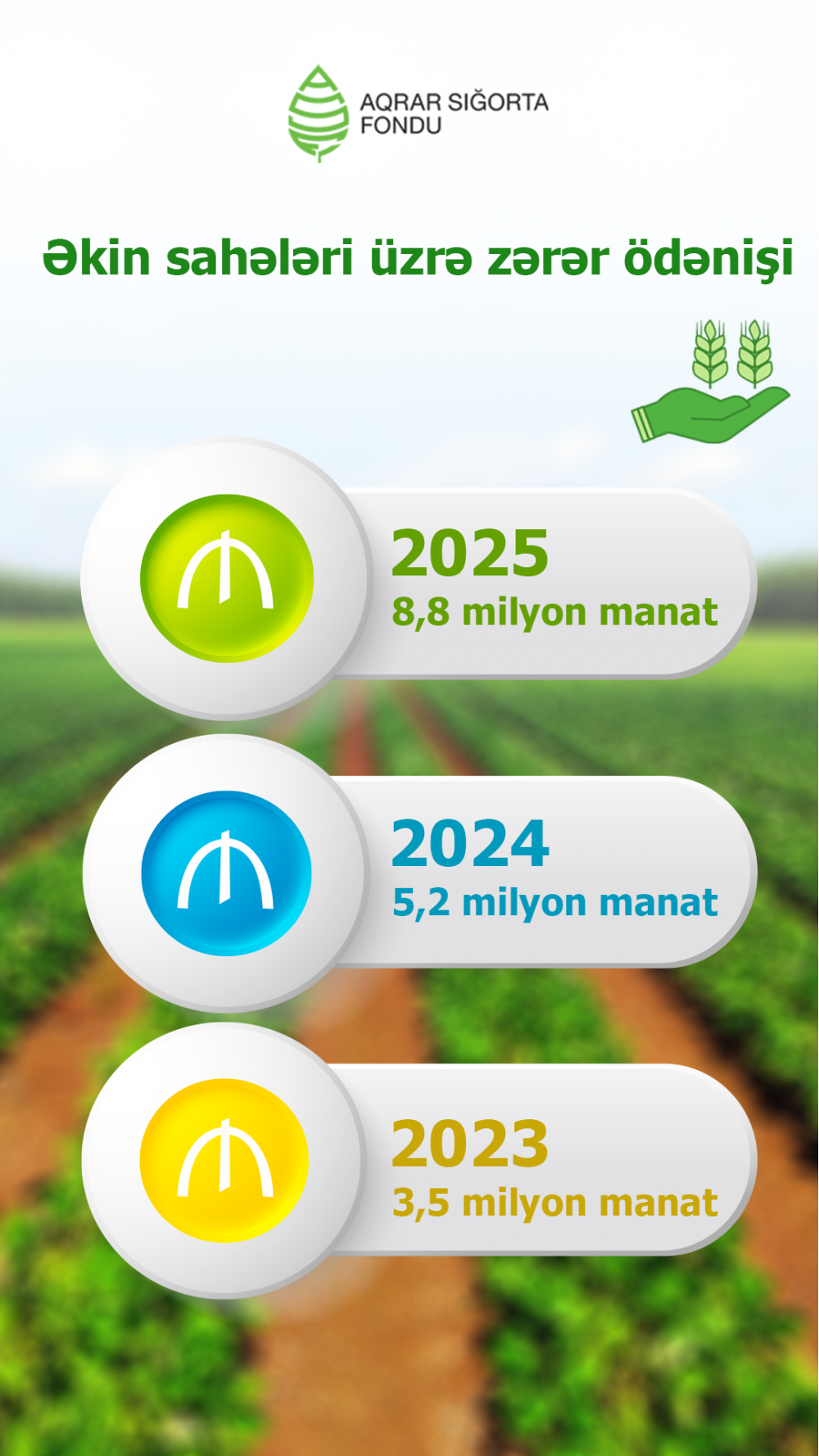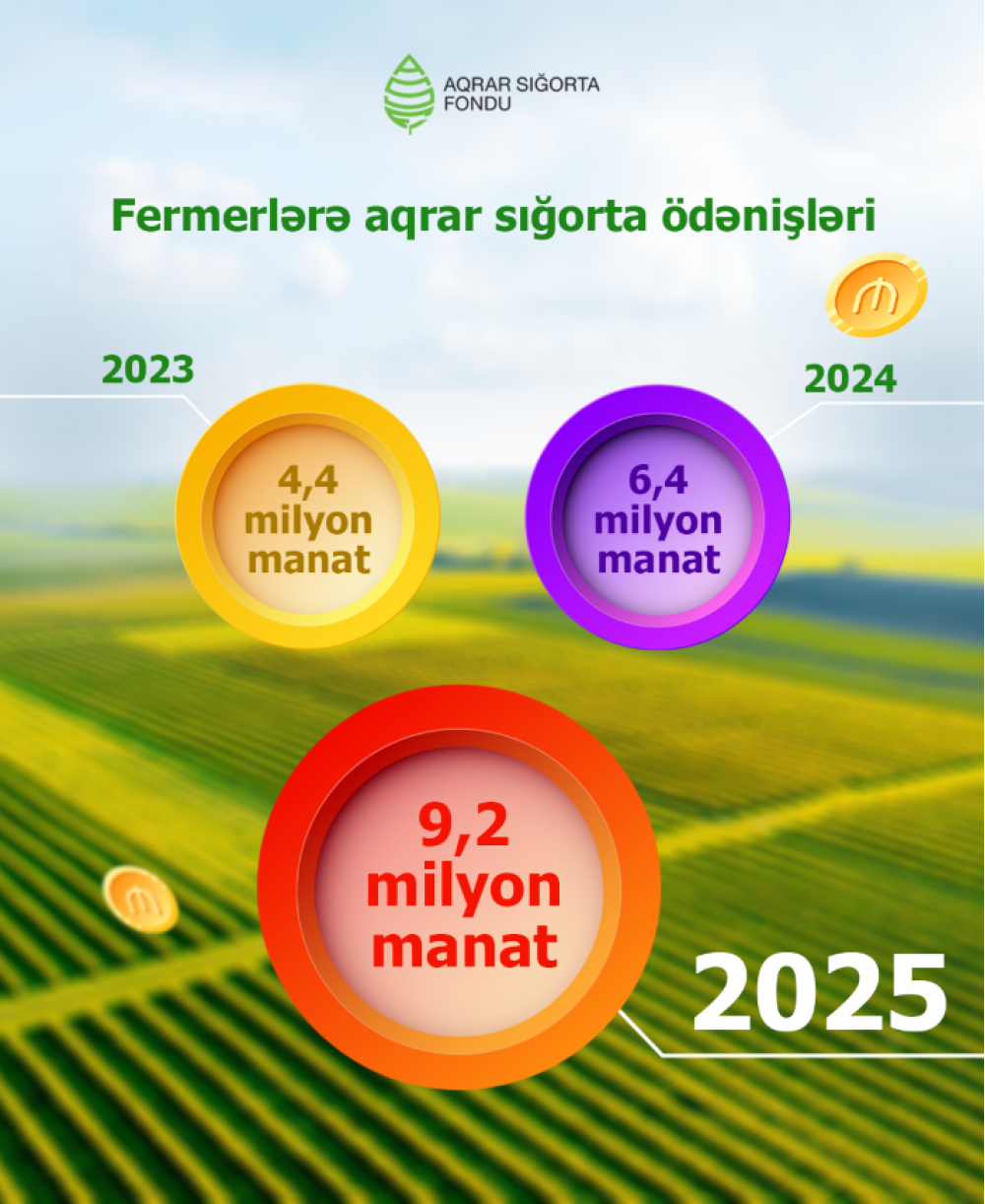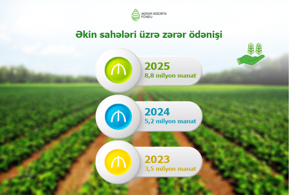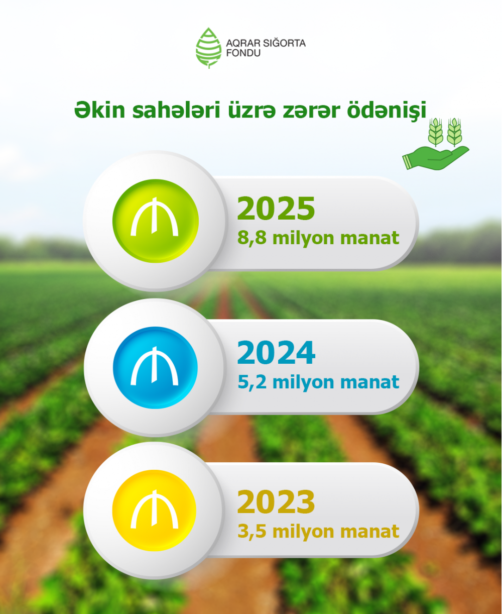 2025-ci ildə əkin sahələrində baş verən hadisələr üzrə fermer və təsərrüfatlara 8,8 milyon manat sığorta ödəniş edilib. Bu 2024-cü illə müqayisədə 70%, 2023-cü ildəki ödənişlərə nisbətən 2,5 dəfə artıqdır.