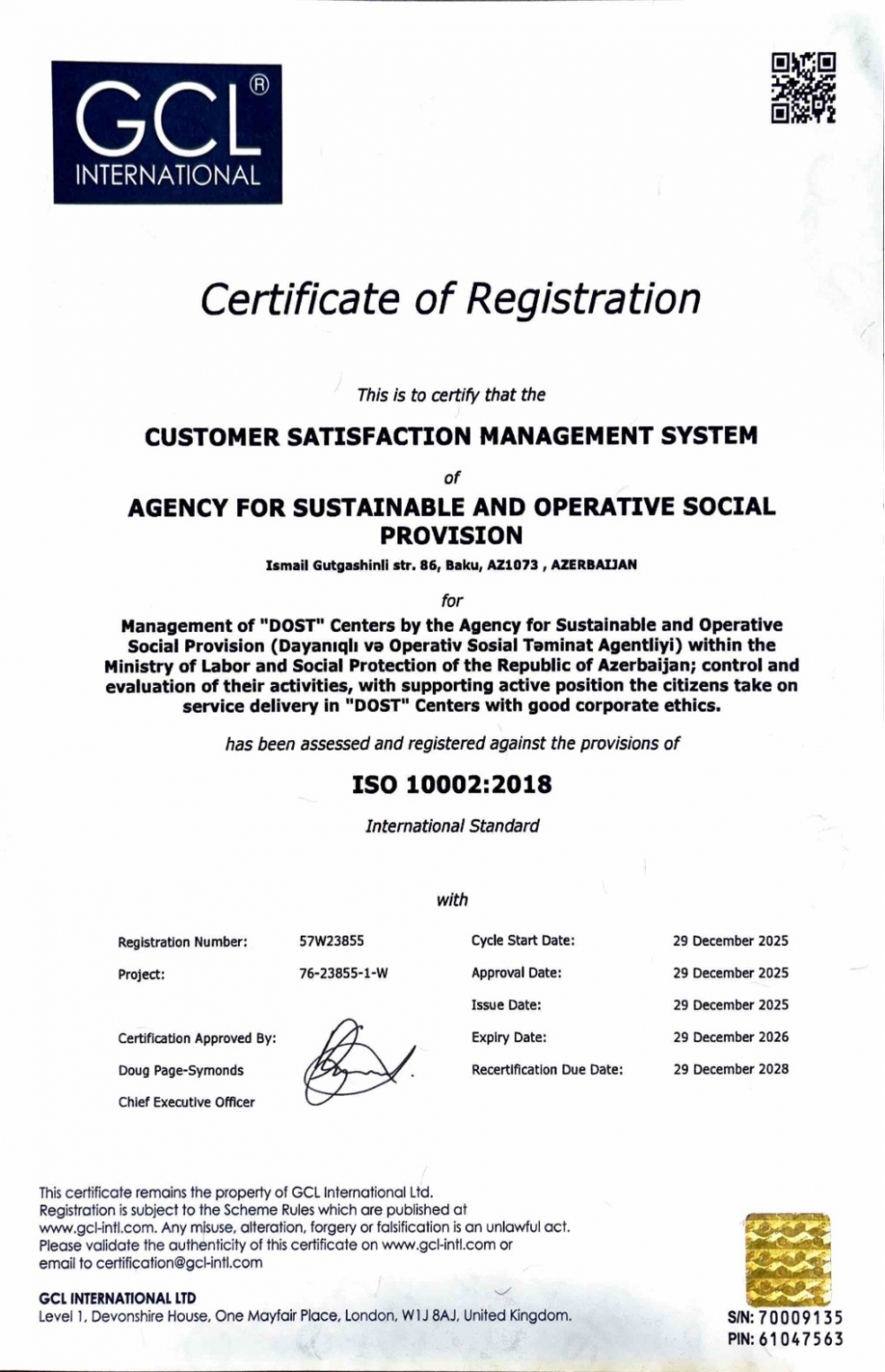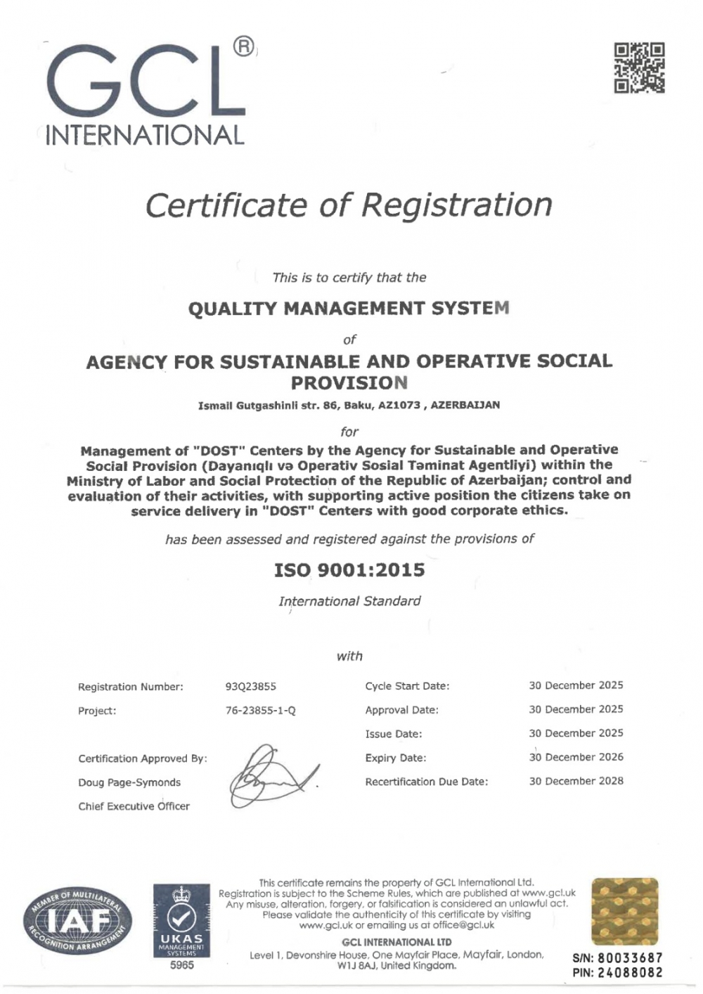 "GCL International" idarəetmə sistemləri üzrə audit və sertifikatlaşdırma sahəsində ixtisaslaşmış beynəlxalq qurumdur və təqdim etdiyi sertifikatlar Böyük Britaniyanın rəsmi akkreditasiya orqanı olan "UKAS" tərəfindən təsdiq olunur.