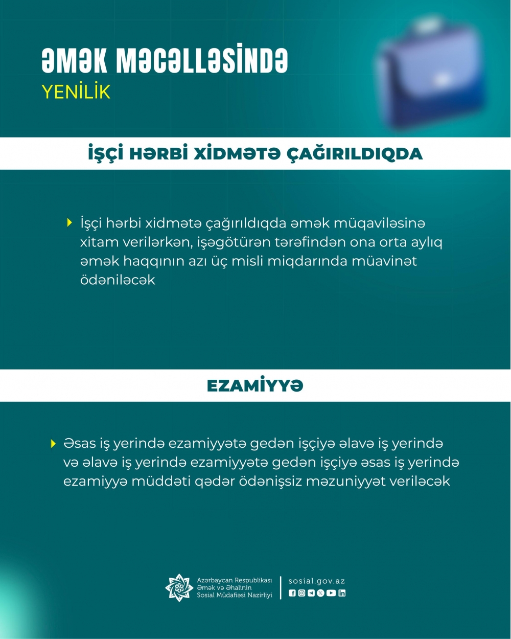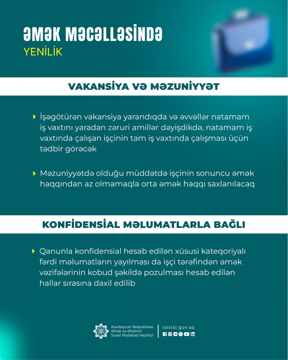 Əmək Məcəlləsindəki anlayışlar sırasına "Ailə vəzifələri olan işçi" anlayışı daxil edilib. Bu anlayış qulluğa və ya köməyə ehtiyacı olan ailə üzvünə qulluq, kömək göstərilməsi ilə əlaqədar əmək fəaliyyətinə başlamaq, əmək funksiyasını yerinə yetirmək imkanları məhdud olan işçini nəzərdə tutur.