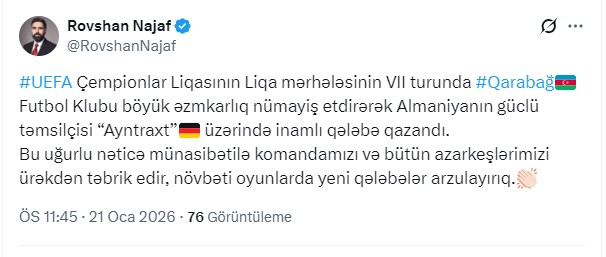 AFFA prezidenti Rövşən Nəcəf "Qarabağ" klubunu UEFA Çempionlar Liqasının əsas mərhələsinin VII turunda Almaniyanın "Ayntraxt" klubu üzərində 3:2 hesablı qələbə qazanması münasibətilə təbrik edib.