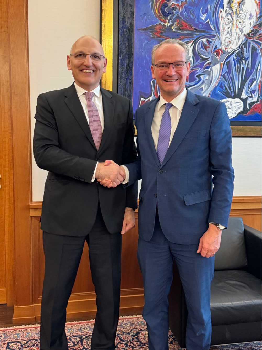 Almaniya Federativ Respublikasına işgüzar səfəri çərçivəsində Azərbaycan Respublikası Prezidentinin xüsusi tapşırıqlar üzrə nümayəndəsi Elçin Əmirbəyov XIN-in Avropa məsələləri üzrə dövlət naziri Günter Krixbaum, Prezidentinin xarici siyasət üzrə müşaviri Volfqanq Dold, AFR kanslerinin xarici və təhlükəsizlik siyasəti məsələləri üzrə müşavirinin müavini Aleksander Eberl, Bundestaqın xarici siyasət komitəsinin sədri Armin Laşet, Bundestaqının Almaniya-Cənubi Qafqaz parlamentlərarası əlaqələr üzrə işçi qrupunun rəhbəri Mirze Edis və qrupun digər üzvləri, və AFR Xarici İşlər Nazirliyinin Şərqi Avropa, Qafqaz və Mərkəzi Asiya üzrə direktoru Niklas Vaqner ilə görüşlər keçirib.