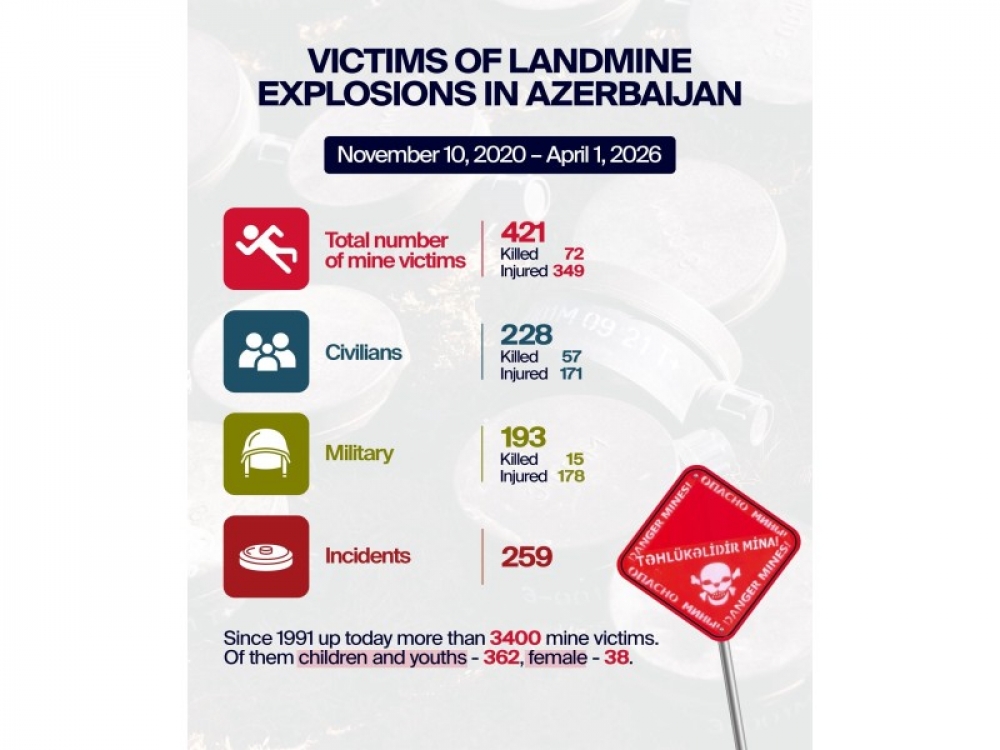 Azərbaycanın ərazisinin təxminən 12 faizi 30 illik işğal dövründə Ermənistan tərəfindən yerləşdirilmiş 1,5 milyondan çox mina ilə çirkləndirilib.