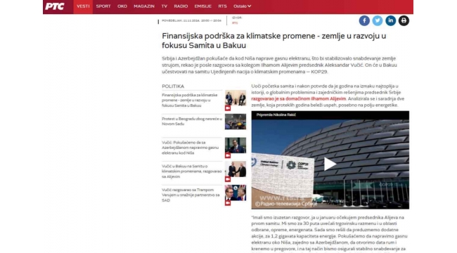 Serbiyanın “RTS” kanalı COP29-un ilk gününü geniş işıqlandırıb
