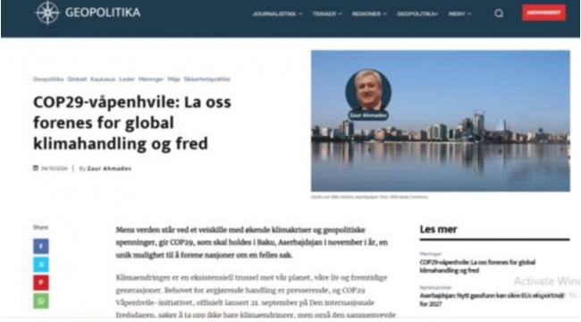 "Geopolitika”da Azərbaycan diplomatının COP29 zamanı atəşkəs təşəbbüsü haqqında məqaləsi dərc olunub