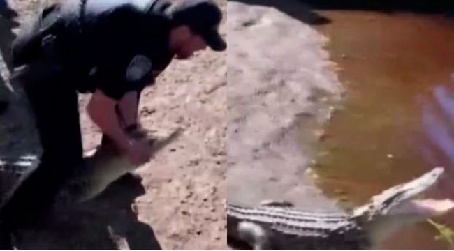 Polis timsahı əlləri ilə çaya buraxdı