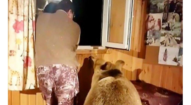 Ayı pəncərədən baxan sahibini qucaqlayıb öpdü