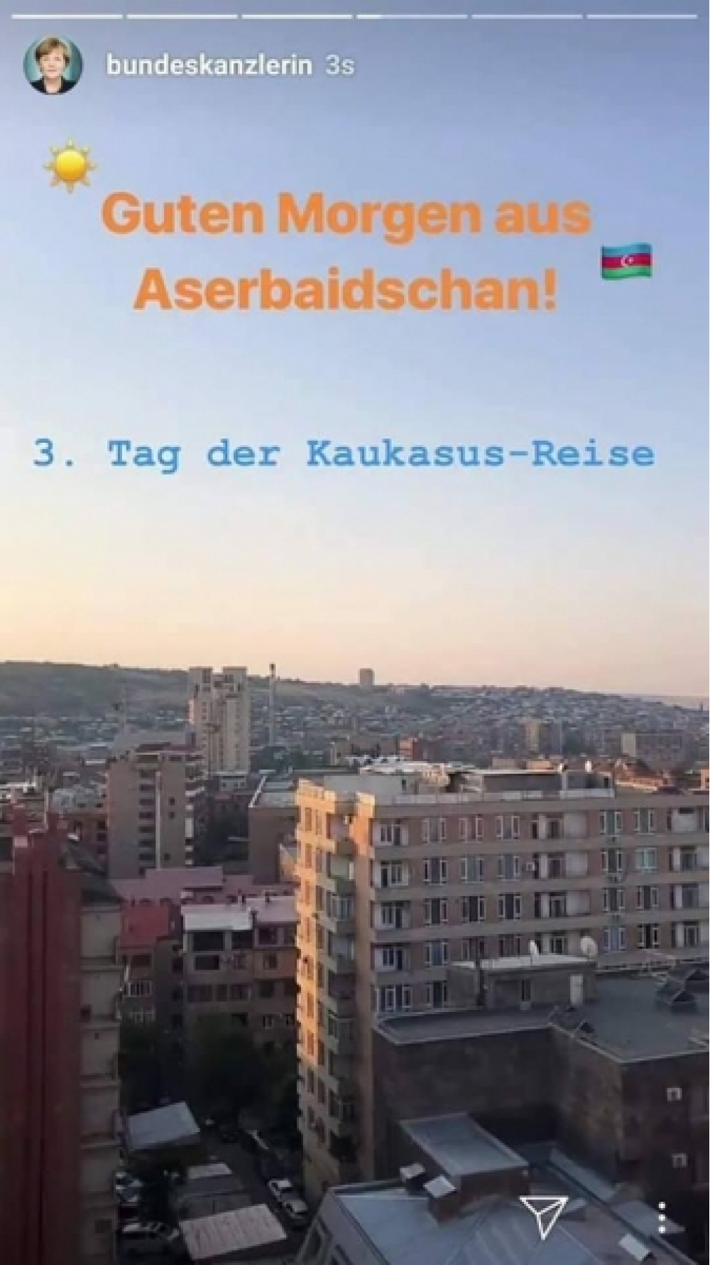 Publika.az xəbər verir ki, kansler instaqram hesabının hekayə bölməsinə İrəvanda çəkdiyi şəhər panoramasını paylaşıb və üzərində “Günaydın, Azərbaycan. Qafqaz ziyarətimin 3-cü günü” yazıb.