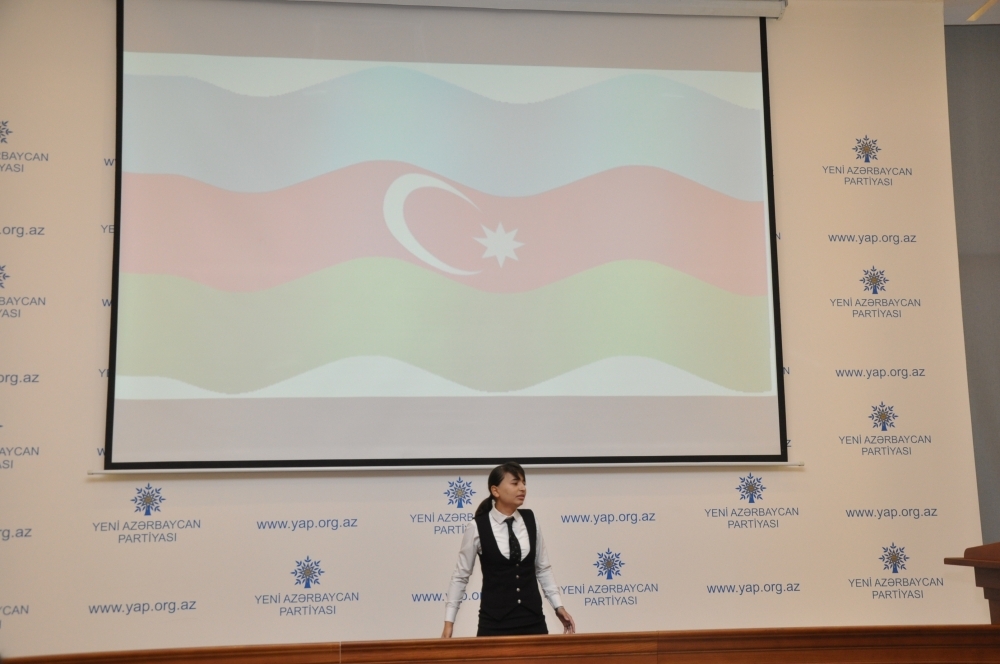 Tədbirdə çıxış edən YAP Gənclər Birliyinin sədri Seymur Orucov bildirib ki, bayraq millətin ruhunu özündə ehtiva etməklə yanaşı, dövlətin varlığını sübut edən rəmzdir. Onun sözlərinə görə, bir millətin dövləti varsa, bayrağı da var. Azərbaycan bayrağı da özünün rənglərindəki fəlsəfi mənası ilə xalqımızın düşüncəsini, ruhunu, xarakterini əks etdirir.