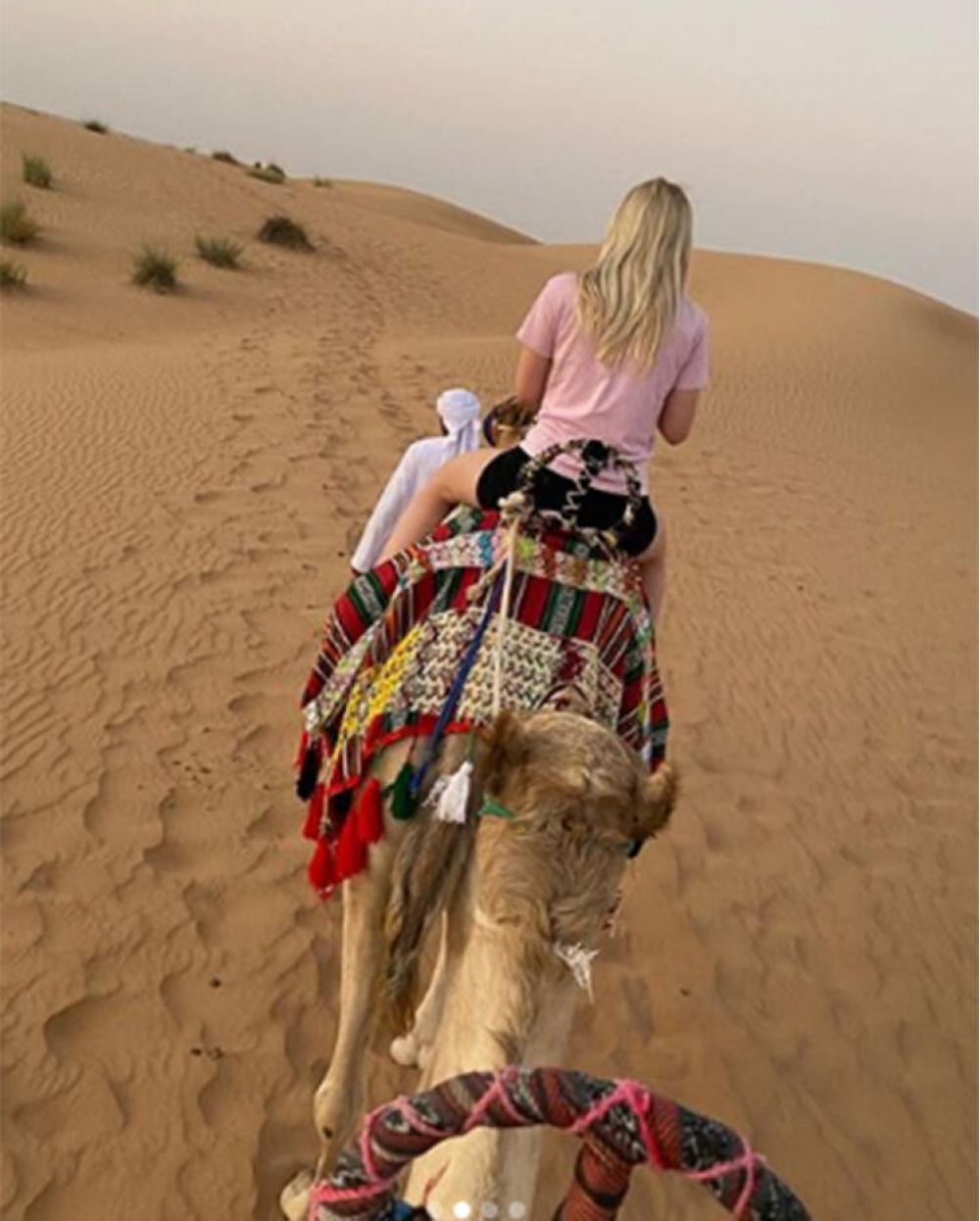 Azərbaycan səfərindən sonra Dubaya yollanan müğənni son olaraq dəvəyə mindiyi şəkillərini izləyiciləri ilə paylaşıb.