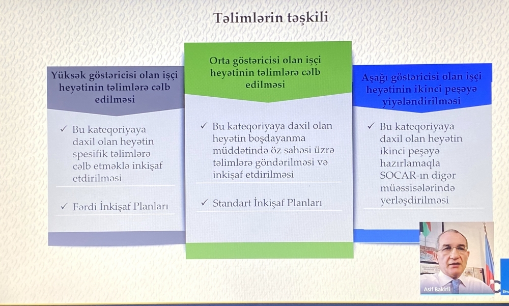 SOCAR-ın İnsan Resursları Departamentinin rəisi Asif Bəkirli geniş təqdimatla çıxış edib, 2019-cu ildə SOCAR-ın insan resursları sahəsində əsas fəaliyyət göstəricilərindən, insan resurslarının transformasiya proqramından bəhs edib.