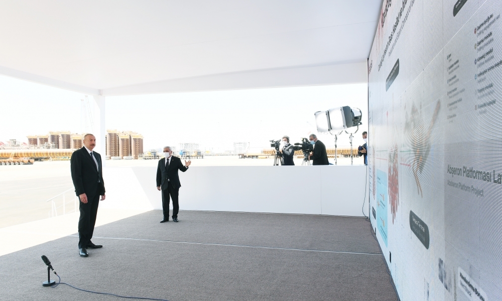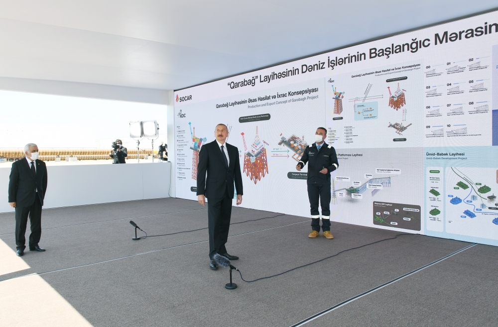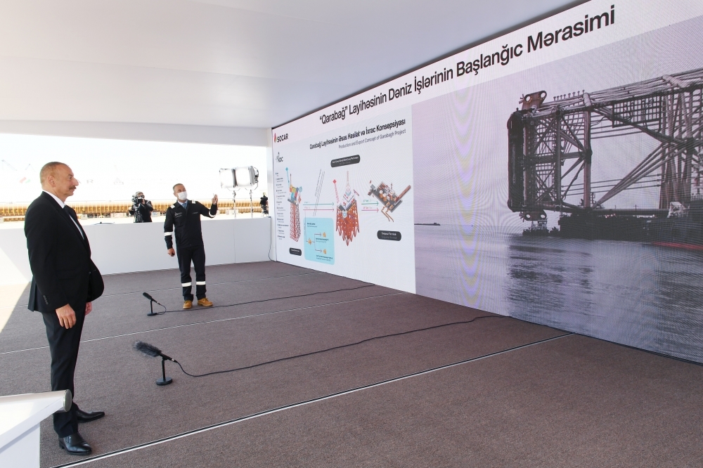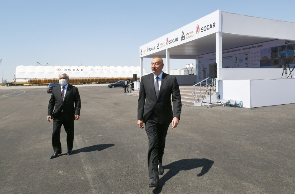Prezident İlham Əliyev “Qarabağ” yatağının dayaq blokunun dənizə yola salınması mərasimində iştirak edib