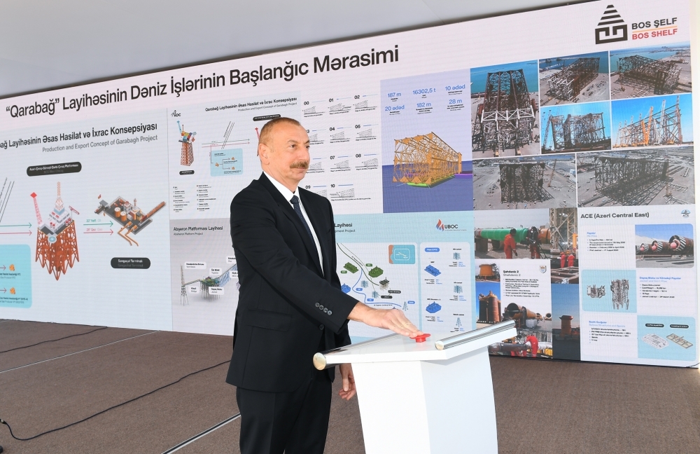 -Bu, çox əlamətdar hadisədir. Bu gün “Qarabağ” yatağının dəniz işlərinə start verilir. Bu, yatağın işlənməsində çox önəmli mərhələdir. Bu nəhəng qurğu Azərbaycan mütəxəssisləri tərəfindən ölkəmizdə inşa edilibdir və bu gün artıq dənizə yola salınır. Əminəm ki, özülün üst hissəsi də vaxtında tikiləcək və beləliklə, biz “Qarabağ” yatağının tammiqyaslı işlənməsinə başlayacağıq.