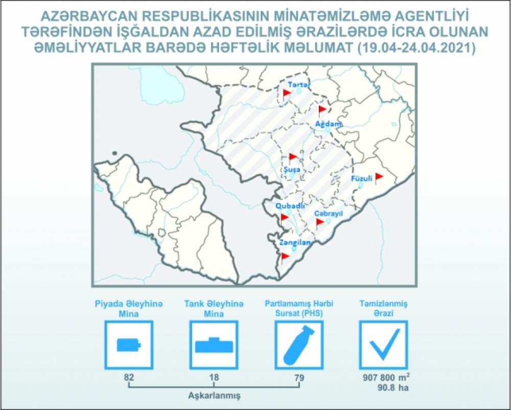 ANAMA-dan "İki sahil"ə bildiriblər ki, aprelin 19-dən 24-dək Tərtər, Ağdam, Füzuli, Şuşa, Qubadlı, Cəbrayıl və Zəngilanda aparılmış əməliyyat-axtarış tədbirləri zamanı piyada əleyhinə 82, tank əleyhinə 18 mina və 79 partlamamış hərbi sursat aşkarlanaraq zərərsizləşdirilib.