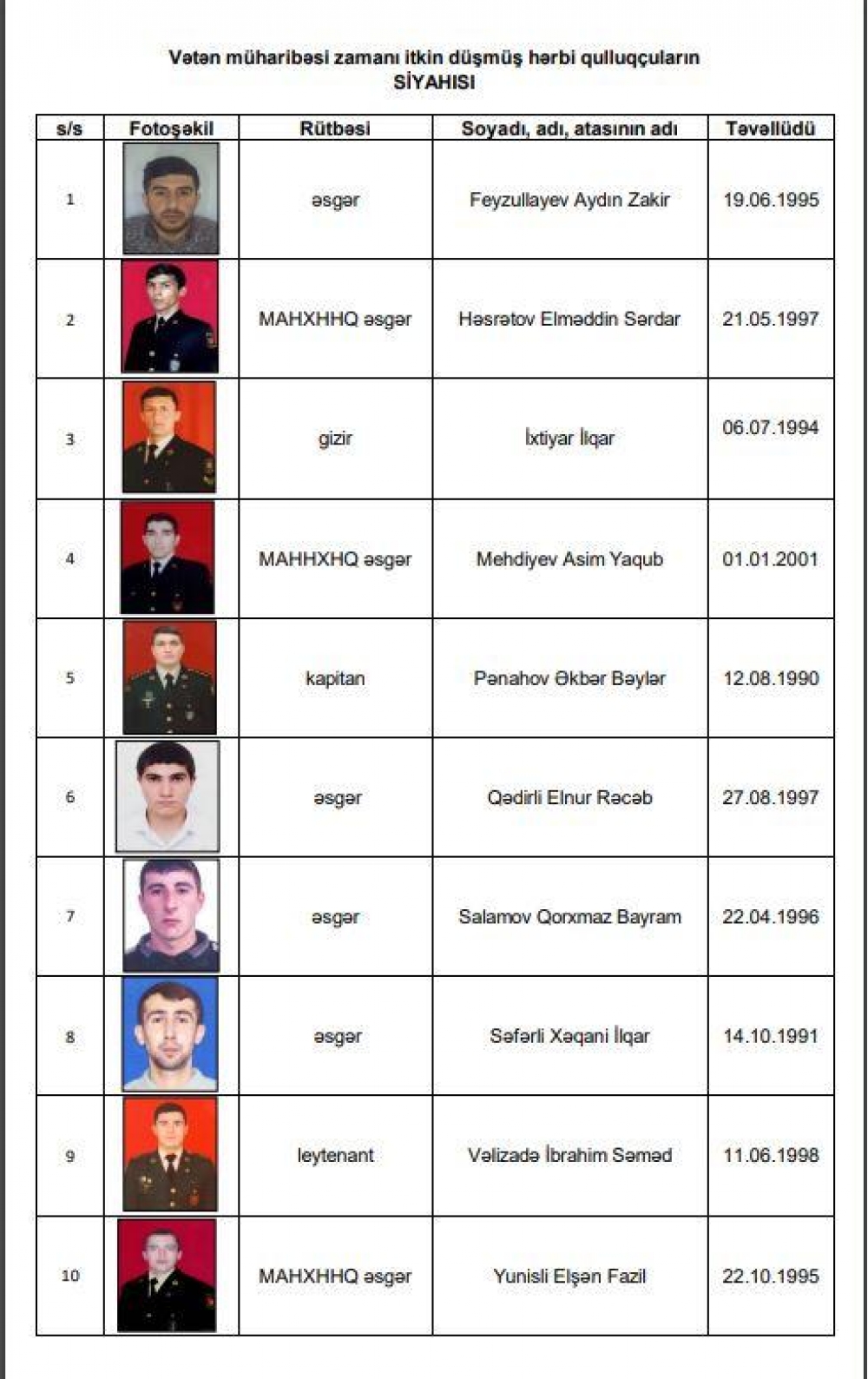 "İki sahil" xəbər verir ki, iyunun 14-dək itkin düşmüş hesab olunan 10 nəfərin foto şəkilləri, adları, soyadları, hərbi rütbəsi və doğum tarixi haqqında məlumat təqdim olunub.