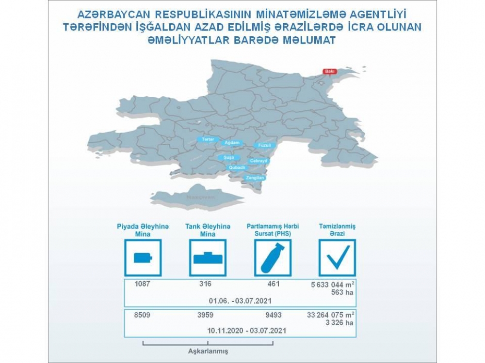 ANAMA-dan "İki sahil"ə verilən məlumata görə, iyunun 1-dən iyulun 3-dək Tərtər, Ağdam, Füzuli, Şuşa, Qubadlı, Cəbrayıl və Zəngilanda aparılan əməliyyat-axtarış tədbirləri zamanı piyada əleyhinə 1087, tank əleyhinə 316 mina və 461 partlamamış hərbi sursat aşkarlanaraq zərərsizləşdirilib.