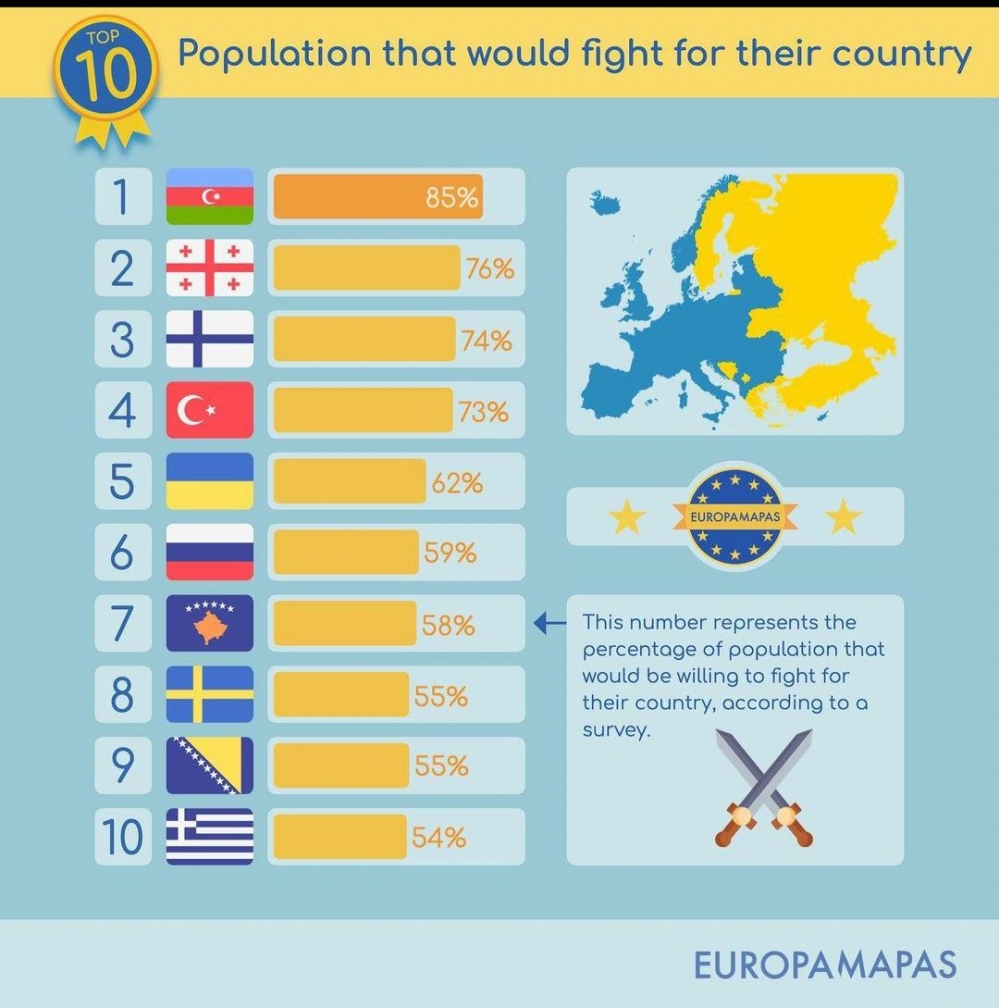 Hazırlanan infoqrafikada Azərbaycan əhalisi öz vətəni uğrunda döyüşməyə hər an hazır olan ölkələr arasında ilk sırada qərarlaşıb.