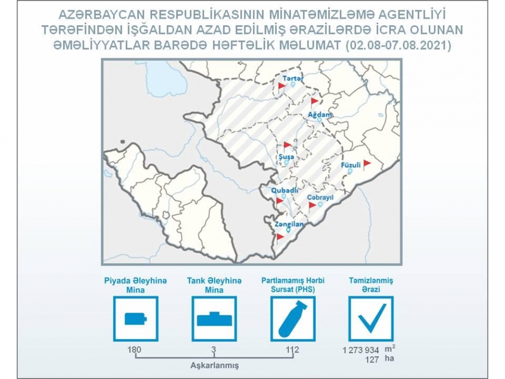 ANAMA-dan "İki sahil"ə verilən məlumata görə, avqustun 2-dən 8-dək Tərtər, Ağdam, Füzuli, Şuşa, Qubadlı, Cəbrayıl və Zəngilan rayonlarının ərazilərində aparılmış əməliyyat-axtarış tədbirləri zamanı piyada əleyhinə 180, tank əleyhinə 3 mina və 112 ədəd partlamamış hərbi sursat aşkarlanıb.