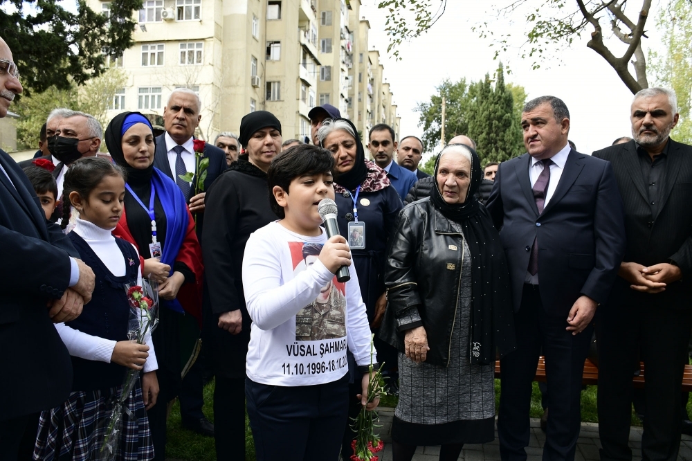Çıxış edən Əməkdar artist, bədii qiraətçi Azad Şükürov şəhidlərin adlarının əbədiləşdirilməsi məqsədilə görülən işlərə, keçirilən tədbirlərə, anım mərasimlərinə görə öz adından və mərasim iştirakçıları adından Xətai Rayon İcra Hakimiyyətinin, eləcə də YAP Xətai rayon təşkilatının rəhbərliyinə minnətdarlığını bildirib. A.Şükürov şəhid analarına və yaxınlarına təsəlli verərək qeyd edib ki, biz bu oğulların sayəsində şərəfli anlar yaşayırıq: “Etiraf etmək lazımdır ki, şəhidlərimiz, qazilərimiz, Vətən müharibəsində iştirak edən qəhrəman övladlarımız üzərimizdəki 30 illik xəcalət tozunu siliblər. Azərbaycan Ordusunun əsgər və zabitlərinin döyüş şücaətindən bütün dünya bəhrələnir. Bununla biz hər birimiz fəxr edirik. Burada olan qazilərimizin gözünə baxıram, qəribə qürur hissi keçirirəm. Azərbaycan Ordusu 44 günün içində adımızı, şərəfimizi, qürurumuzu bizə qaytardı. Şəhidlərimizin anım və doğum günü fəxarətlə qeyd edirik. Körpələrimizin üzündən səadət yağır. Onlar əllərində güllər Qələbəmizin memarlarını alnıaçıq, başı dik yad etməyə gəliblər. Şəhid valideynlərinə üzümü tuturam, başa düşürəm ki, övlad itkisi ağırdır, böyük kədərdir. Allah hər birinizə səbir versin. Can qurban eləməyin vaxtı çatmışdı. Bizim xalqımızın igid övladları yer üzündə ən şirin nemət olan həyatlarını Vətən yolunda qurban verdilər. Torpaqlarımızı azad etdilər . Bayraqlarımızı doğma Qarabağımızda ucaltdılar.”