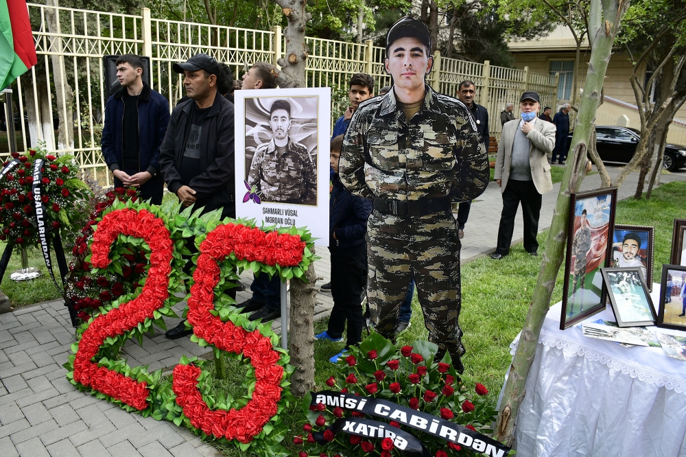 Sonda şəhidin xatirə lövhəsinin qarşısına tər güllər düzülüb.