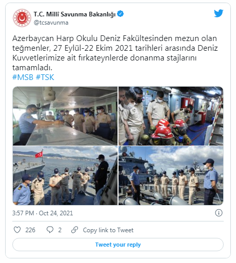 Azərbaycan Hərbi Akademiyasının Hərbi Dənizçilik fakültəsini bitirən leytenantlar 27 sentyabr - 22 oktyabr 2021-ci il tarixlərində Türkiyədə keçirilən Hərbi Dəniz Qüvvələrinin freqatlarında hərbi dəniz təcrübə kursunu başa vurublar.