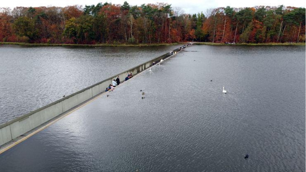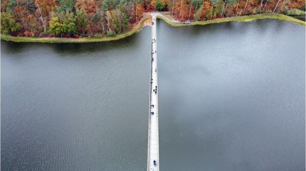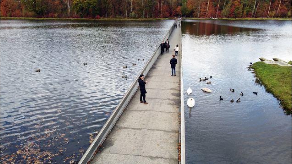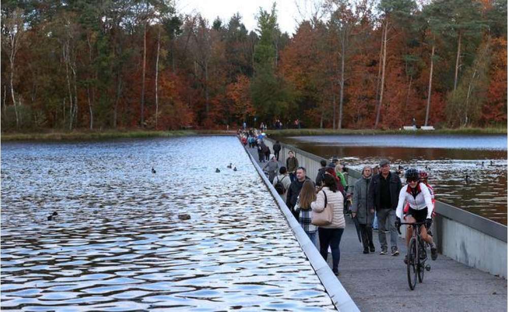 Belçikanın Limburq bölgəsindəki Bokrijk gölündəki suüstü yolda insanlar ağacların arasında, göldə üzən qu quşları ilə göz səviyyəsində velosiped sürərək və ya gəzərək əylənirlər.