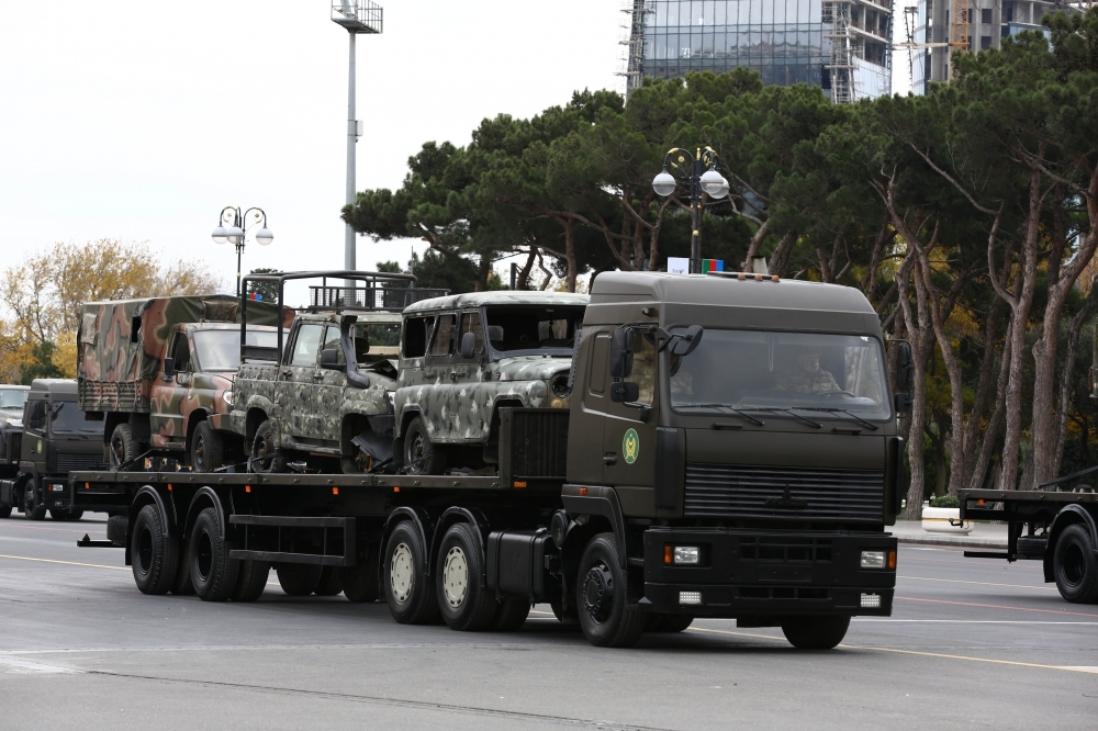 Paradın ən yaddaqalan və qürurverici anlarından biri də Azadlıq meydanına 44 günlük Vətən müharibəsində düşməndən qənimət götürülmüş hərbi texnikaların bir qisminin gətirilməsi oldu. Xüsusilə Vətən müharibəsi zamanı Azərbaycan Silahlı Qüvvələrinin işğaldan azad olunan ərazilərdə ermənilərdən qənimət götürdüyü və sıradan çıxardığı 2 mindən çox avtomobilin nömrə nişanlarından hazırlanan və üzərinə “Qarabağ Azərbaycandır!” şüarının həkk olunduğu kompozisiyanın nümayişi hər bir azərbaycanlıya sonsuz qürur hissi yaşatdı. Ermənistanda ordusundan qənimət götürülmüş istifadəyə yararlı texnikalar - “KamAZ” markalı avtomobilin qoşqusunda D-30, “Ural” markalı avtomobilin qoşqusunda D-20 topları, qoşqu üzərində zenit qurğuları, “ŞİLKA”, “OSA-1T”, “KUB” zenit-raket kompleksləri, piyadaların döyüş maşınları (PDM), “T-72” tankları, eləcə də istifadəyə yararsız texnikalar - zirehli “UAZ Patriot”, “UAZ Hunter” minik, “ZİL-131”, “Ural”, “KamAZ” markalı yük avtomobilləri, 122 millimetrlik “Qvozdika” özüyeriyən artilleriya qurğusu, BM-21 “Qrad” qurğuları, PDM-1 və PDM-2 texnikaları, T-72 tanklarının nümayişi qəhrəman Azərbaycan Ordusunun düşmənə sarsıdıcı zərbələr vurduğunun əyani təsdiqi oldu.
