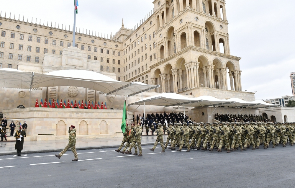 Təntənəli hərbi paradda Vətən müharibəsində döyüşlərdə əsl qəhrəmanlıq, şücaət, rəşadət və yüksək peşəkarlıq nümunələri göstərərək xalqımıza Böyük Qələbənin sevincini yaşadan Müdafiə Nazirliyinin Xüsusi Təyinatlı Qüvvələrinin və digər qoşun birləşmələrinin, Hərbi Dəniz Qüvvələrinin, Xarici Kəşfiyyat Xidmətinin, Dövlət Təhlükəsizliyi Xidmətinin, Əlahiddə Ümumqoşun Ordunun, Raket və Artilleriya Qoşunlarının, Dövlət Sərhəd Xidmətinin, Daxili İşlər Nazirliyinin Daxili Qoşunlarının, Azərbaycan Respublikası Prezidentinin Təhlükəsizlik Xidmətinin Milli Qvardiyasının hərbi qulluqçularının tribuna önündən mətin addımlarla irəliləməsi Azərbaycan Ordusunun hərbi qüdrətinin, qəhrəman əsgər və zabitlərimizin vətənpərvərliyinin, rəşadətinin və Qələbə əzmini ifadəçisi idi.