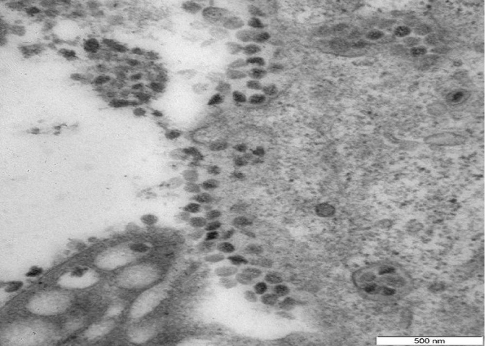 Dərc edilmiş fotolarda əksər hallarda hüceyrədaxili şəbəkənin genişlənmiş boruları olan vezikulyar strukturları (qabarcıq) göstərir. Virusu təşkil edən zülallar bu qabarcıqların ətrafında toplanır və müəyyən fiziki və kimyəvi şəraitdə içəriyə nüfuz edərək əlavə bir örtük alır.