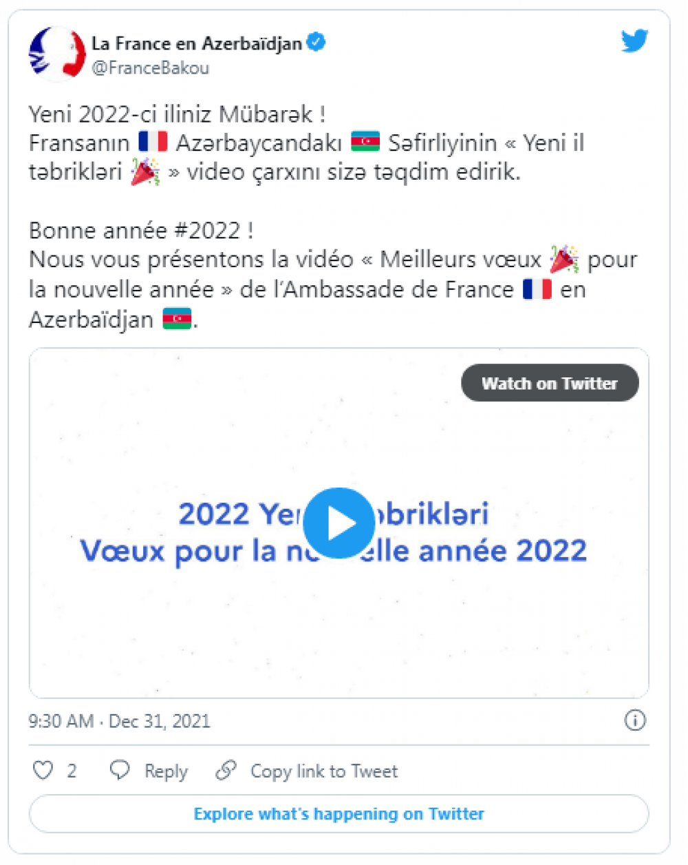Fransanın Azərbaycandakı səfirliyi Azərbaycan xalqını Yeni il bayramı münasibətilə təbrik edib.